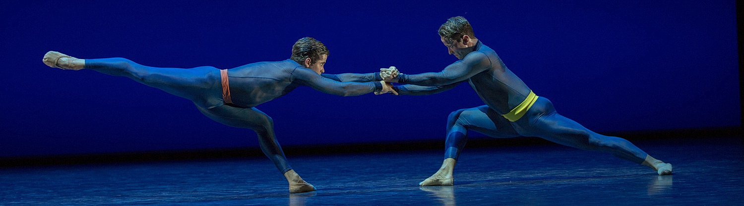 Die Idee des gleich­ge­schlecht­lichen Paartanzes vertieft So-Yeon Kim in ihren Rococo Varia­tions, einer etwa 20-minütigen Aufführung, mit der Freunde des klassi­schen Balletts voll und ganz auf ihre Kosten kommen. Hier lässt sich der englische Titel sogar recht­fer­tigen, formen die sechs Tänzer das Wort gleich zu Beginn der Darstellung körperlich als Scheren­schnitt. Und das ist sogar gut erkennbar, denn Diek lässt in dieser Choreo­grafie eine Grund­be­leuchtung zu. Kim hat zudem eine blau erleuchtete Rückwand gewählt, vor der ein Kronleuchter in den Vorder­grund rückt. Zu den Varia­tionen über ein Rokoko-Thema op. 33 für Violon­cello und Orchester von Peter Tschai­kowsky gibt es klassi­sches Ballett vom Feinsten, technisch mit höchster Präzision darge­boten, choreo­gra­fisch höchst einfalls­reich und mit der nötigen Freude am höfischen Tanz versehen. Die Kostüme von Irene Vaqueiro im klassi­schen Schnitt mit Tütü, aber in modernen Farben unter­streichen die Wirkung. Der Pas de deux von Mann und Mann respektive Frau mit Frau mag künst­le­risch wertvoll sein, weil er Sehge­wohn­heiten bricht. Ein ästhe­ti­scher Gewinn ist darin nicht erkennbar. Kontrast gegen Gleich­för­migkeit einzu­wechseln, war noch nie ein guter Tausch. Aller­dings schadet es dem positiven Gesamt­ein­druck auch nicht.