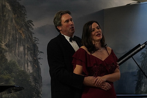 Mameghani eröffnet den Nachmittag mit Alt Wien von Leopold Godowsky, ehe Robert Hotstegs die Moderation übernimmt. In gewohnt humorvoller Weise nimmt er das Publikum mit nach Wien – er empfiehlt den Nachtzug, der täglich kurz nach 21 Uhr Düsseldorf verlässt – um es in das Kaffeehaus mit seiner typischen Musik einzuladen. Und da geht es schon mal schön mit dem Evergreen Ich schenk mein Herz aus Carl Millöckers Operette Die Dubarry weiter. Dazu tritt Dinah Berowska an und lässt sich von Ievgeniia Iermachkova begleiten. Die Sopranistin ist in Thüringen geboren und studierte an der Robert-Schumann-Hochschule Düsseldorf, Iermachkova ist auf der Krim geboren, studierte Klavier an der Ukrainischen Nationalen Musikakademie und schloss ihr Studium an der Folkwang-Universität Essen ab. Seit vielen Jahren ist sie Dozentin für Klavier, Kammermusik und Korrepetition an der Internationalen Musikakademie Anton Rubinstein in Düsseldorf.
