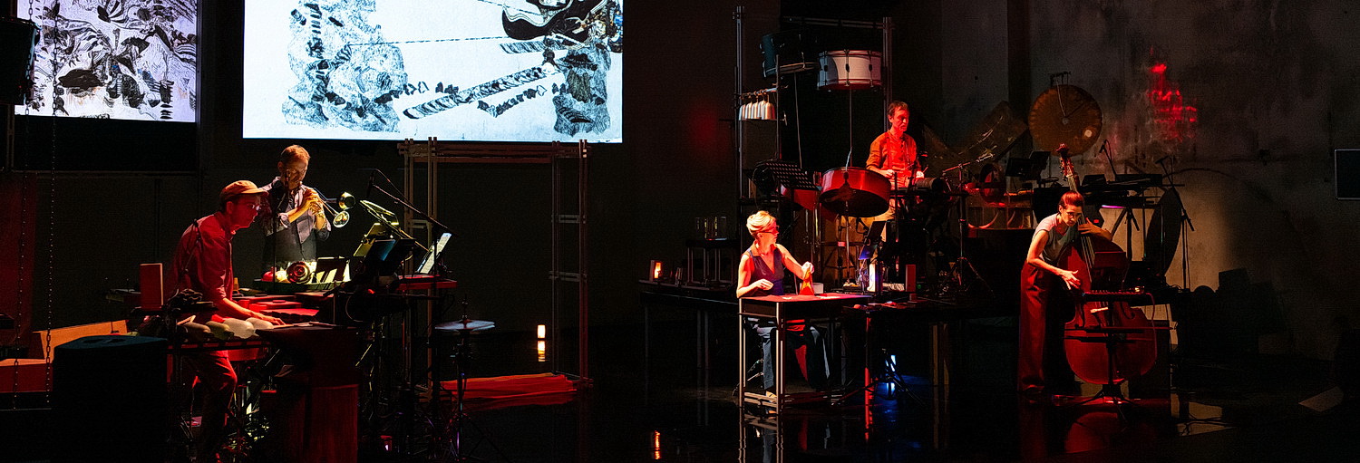 Auf den Monitoren entwickeln sich allmählich aus Strichen schroffe Gebilde, die wie angedeutete Steinkohlebrocken aussehen. Oder es entstehen Schächte und Stollen. Fabelwesen flanieren schattenhaft. Eine unwirkliche Reise ins tiefschwarze Dunkel des Erdinneren mit all seinen Geräuschen, Absonderlichkeiten, Begegnungen wird so zum Ausdruck gebracht. Zu guter Letzt geht es ins gleißende Licht. In Zeitlupe werden schließlich die skizzenhaften Industriearchitekturen von Wurzeln überwuchert, als eroberte die Natur ihr vom Menschen geraubtes und zerstörtes Land wieder zurück. Alles ist dunkel, schwarz, in Grautönen gehalten. Schummrig ist auch die Bühne. Die wenigen kleinen Spots dienen als Sehhilfe für die Musiker und gemahnen mit ihrem schwachen gelb-roten Licht an alte Grubenlampen.