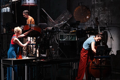 In seiner Komposition hat Aperghis die drei Originale zerpflückt in bewusst unverständliche Brocken, Silben, Vokale und Konsonanten. Hauptsächlich im hohen Register intoniert Sopranistin Donatienne Michel-Dansac gekonnt unverkrampft vom kontemplativen Pianissimo bis hin zum schrill-markerschütternden Fortissimo. Nicht nur sie, auch die beiden Perkussionisten Christian Dierstein und Dirk Rothbrust, Trompeter Marco Blaauw und Kontrabassistin Sophie Lücke sind ausgewiesene, renommierte Musiker in Sachen zeitgenössischer Musik. So bringen auch die vier Instrumentalisten die vertrackte Partitur äußerst differenziert zu Gehör. Mit dieser Tonschöpfung zeigt sich der Komponist sehr experimentierfreudig, indem er etwa Trompete und Kontrabass Klänge und Geräusche entlocken lässt, die vordergründig mit diesen Instrumenten nichts zu tun haben. Und die beiden raumfüllenden Perkussionsbereiche bieten eine Vielzahl an tradierten, exotischen uns alltäglichen Schlaggegenständen, die rhythmisch, strukturell klangfarben- wie geräuschreich sehr komplex verwendet werden. Kleine Tonfragmente gehen Hand in Hand mit rhythmischen, vielschichtigen Geräuschen, die streckenweise im Kontrast zu den sich verändernden projizierten Schraffierungen stehen. Die vielschichtige Klangsprache lässt aufhorchen und macht Lust auf mehr davon. Doch birgt sie im gesamten Verlauf auch Längen, da sich Passagen nur leicht variiert zu oft wiederholen. Zu plakativ sind außerdem das Kettengerassel sowie das Hämmern auf Bleche, Stahlplatten und Amboss. Diese Passage wirkt wie ein Zugeständnis an diejenigen, die sich einen Bezug zum realen Leben eines Malochers in einem Stahlwerk wünschen.