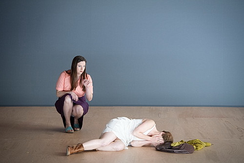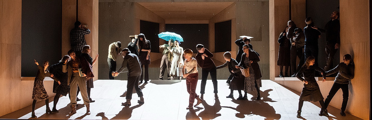 Die Wolga, das Sinnbild einer intakten, friedlichen Natur, wird damit zum Rettungsanker der Frau. Zu sehen ist der Fluss in Gürbacas Inszenierung nur zu Beginn in einer Videoeinspielung. Danach schließen sich die hölzernen Mauern der Bühnenbauten von Henrik Ahr und lassen nur noch enge Schlupflöcher und gelegentliche Ausblicke in leere Hintergründe zu. Eine Art Terrarium, in dem sich die Figuren wie fremdgesteuerte Reptilien bewegen und immer wieder zu Standbildern gefrieren. Ausbrüche wie die Affäre Katjas mit ihrem Liebhaber verpuffen als Illusion. Wobei Gürbaca ohnehin nicht die Liebestragödie in den Mittelpunkt stellt, sondern die gesellschaftlichen Zwänge, denen sich Katja durch ihren Suizid entziehen will.