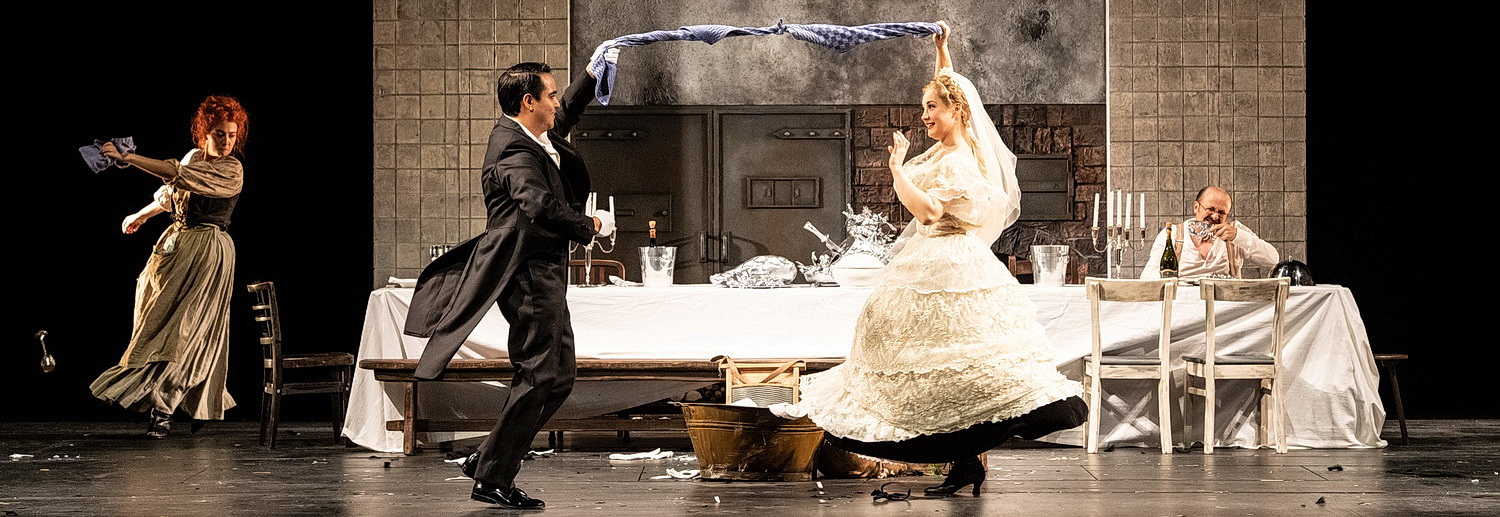 In der Inszenierung von Philipp Westerbarkei und der Ausstattung von Heike Scheele geht es unter und vor der riesigen Abzugshaube recht handwerklich, meistens handfest zu. Bejlja, die verwitwete Köchin, schnibbelt das Gemüse mit Herzenslust, füttert den vor sich hin bruzzelnden Kochtopf mit allem, was passt oder zu passen scheint. Fradl, das Dienstmädchen im funktionsgerechten Dress samt Häubchen, räumt auf, plättet die Wäsche und kokettiert mit dem Brautkleid, das eigentlich für die Herrschaft im oberen Stock vorgesehen ist. Dort bereitet Madame, die Hausherrin, die Verlobung ihrer Tochter vor. Es ist nur eine Frage der Zeit, bis sich Fradl und der Diener Chaim, der ihr nachstellt, „kriegen“.