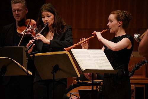 Dorothee Oberlinger ist als Dirigentin alter Musik gefragt, und hier zeigt sie einmal mehr, wie berechtigt das ist. Es herrscht eine fast familiäre Atmosphäre auf der Bühne. Angenehm kurz bleiben ihre Moderationen. Warum man sie immer wieder gern als „Königin der Blockflöte“ bezeichnet, offenbart sie nach der Bachschen Orchestersuite. Da geht es fast spaßhaft zu in Engels Nachtegaeltje aus Der Fluyten Lusthof von Jacob van Eyck, wenn sich Blessing mit einer Sopranflöte auf den Seitenbalkon begibt, um Oberlinger ein Echo zu bieten. Es ist wie ein lächelndes, entspanntes Durchatmen vor dem Coup des Abends.