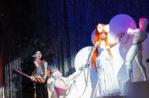 Die von Justin Nardella entworfene Bühne offenbart Originalität. Der zum Saal führende Saal ist zugleich Theater wie Schule. Vermutlich eine Grundschule, wie die bunten Bühnenbilder mit allerlei aufgemaltem Getier vom Drachen bis zum Krokodil erkennen lassen. Äußerst fantasievoll sind die Kostüme von Shalva Nikvashvili. Sie nehmen einmal die Ausstattungsmerkmale des geplanten antiken Dramas auf, Ritterrüstungen und farbigen Federkopfschmuck, zum anderen Merkmale einer queeren Theatertruppe, wie sie sich Kramer vorstellt. Grelle Perücken, Drag-Kostüme, pinkfarbene Morgenmäntel und manches mehr. Agata präsentiert einen künstlichen bombastischen Busen, der die schrille Anlage der Figur noch grotesker macht. Der Herrenchor, einstudiert von Patrick Francis Chestnut, tritt im zweiten Aufzug als muskelbepackte Krieger nach römischen Vorbildern auf. Von seiner guten Performance lenkt bedauerlicherweise der überproportionale, erigierte Penis ab, den jeder dieser Pseudokämpfer ausstellt und bei Tanzeinlagen zum Schwingen bringt.