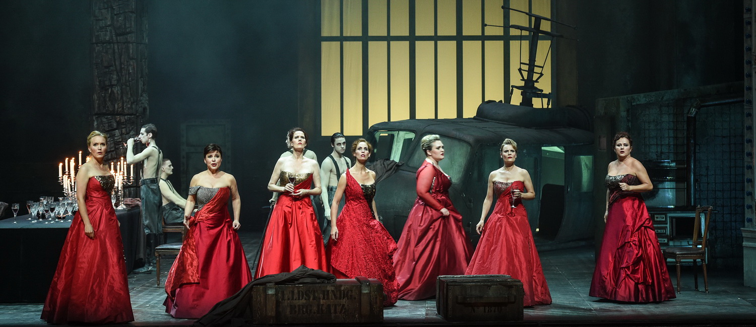 Der erste Akt ist noch sehr werkgetreu als Kammerspiel inszeniert, im zweiten Akt muss dann der komplette Familienclan miterleben, wie Papa Wotan anfangs noch selbstherrlich sein inzestuöses Zwillingspaar Siegmund und Sieglinde verteidigt und seinen ungeliebten Schwiegersohn Hunding auslacht. Der bekommt dann ausgerechnet von seiner Schwiegermutter Fricka die nötige Schützenhilfe. Von nun geht es mit Wotans Plan bergab, die Folgen bekommen alle zu spüren. Dieter Richters zunächst beklemmender Bühnenraum, der an das „Führerhauptquartier“ Wolfschance erinnert, weitet sich unauffällig zum großen Gesellschaftsraum, der vom Krieg gezeichnet ist. Eine nette Idee: Der Film Apocalypse Now nutzt den Walkürenritt, Hilsdorf nutzt Apocalypse Now und zeigt einen abgestürzten Hubschrauber auf der Bühne, aus dem sich die Walküren manchen gefallenen Helden angeln, die wie stoische Zombies über die Bühne schreiten.