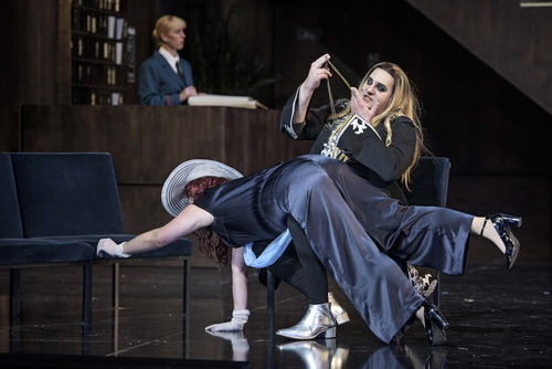 Bei Regisseur Hendrik Müller spielt das Geschehen in einem Hotel. Marc Weeger hat ihm dafür ein hochherrschaftliches Ambiente entworfen, bei dem Wes Andersons Film Grand Budapest Hotel deutlich Pate steht. Schon der Vorspann mit der Besetzungsliste, aus technischen Gründen am Premierenabend verspätet einsetzend, zeigt das Kino-Cover des Berlinale-Gewinners mit röhrendem Hirsch vor Berglandlandschaft. Doch damit nicht genug. Figuren aus dem Film Menschen im Hotel sind unter den Gästen, dazu noch eine Geisha, ein Scheich und viel Personal. Sie alle tummeln sich in der Eingangshalle, wuseln aus den oben gelegenen Zimmern heraus oder bevölkern die prächtige Treppe. Müller erzählt die Geschichte des Fra Diavolo als turbulenten, absurden Klamauk mit kräftigen Anleihen beim Kintopp und Slapstick. Die von ihm selbst geschriebenen Dialoge sind den Aktionen entsprechend grob gestrickt und werden ständig von Life- Barmusik untermalt, was für zusätzliche Unruhe sorgt. Doch gibt es auch einen witzigen Ruhepol: die Schwimm- und Saunaszene im zweiten Akt, in der Zerlina vom Räubertrio beobachtet wird, besitzt delikate Situationskomik.