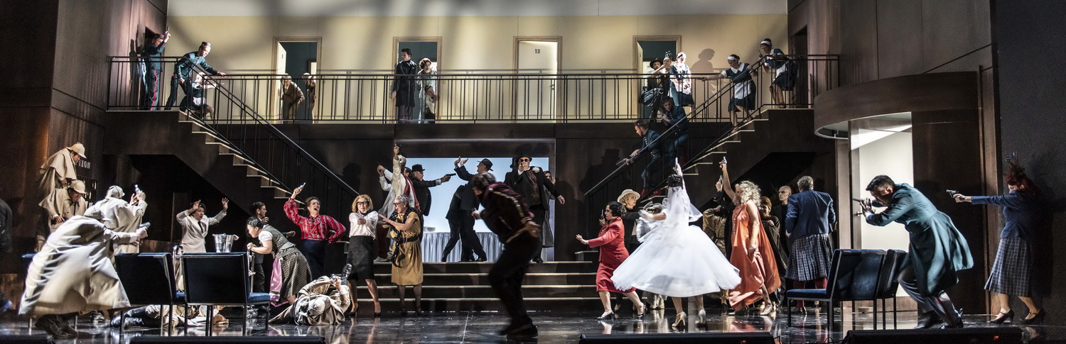 Bei Regisseur Hendrik Müller spielt das Geschehen in einem Hotel. Marc Weeger hat ihm dafür ein hochherrschaftliches Ambiente entworfen, bei dem Wes Andersons Film Grand Budapest Hotel deutlich Pate steht. Schon der Vorspann mit der Besetzungsliste, aus technischen Gründen am Premierenabend verspätet einsetzend, zeigt das Kino-Cover des Berlinale-Gewinners mit röhrendem Hirsch vor Berglandlandschaft. Doch damit nicht genug. Figuren aus dem Film Menschen im Hotel sind unter den Gästen, dazu noch eine Geisha, ein Scheich und viel Personal. Sie alle tummeln sich in der Eingangshalle, wuseln aus den oben gelegenen Zimmern heraus oder bevölkern die prächtige Treppe. Müller erzählt die Geschichte des Fra Diavolo als turbulenten, absurden Klamauk mit kräftigen Anleihen beim Kintopp und Slapstick. Die von ihm selbst geschriebenen Dialoge sind den Aktionen entsprechend grob gestrickt und werden ständig von Life- Barmusik untermalt, was für zusätzliche Unruhe sorgt. Doch gibt es auch einen witzigen Ruhepol: die Schwimm- und Saunaszene im zweiten Akt, in der Zerlina vom Räubertrio beobachtet wird, besitzt delikate Situationskomik.