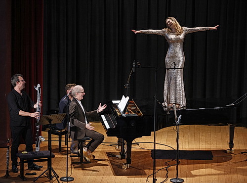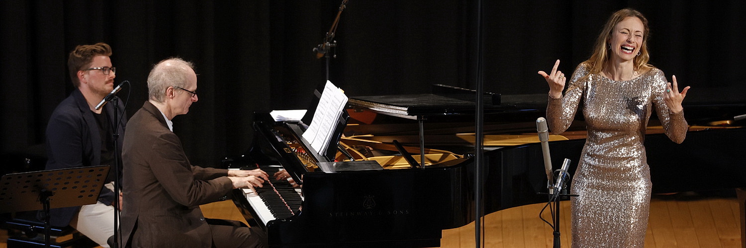 Es handelt sich also um ein buntes Programm, das eine große Palette an stimmlichen Ausdrucksformen voraussetzt. Sarah Maria Sun, die als Spezialistin auf dem Gebiet moderner Musik gilt, verfügt über eine solch große Bandbreite und wird ihrem guten Ruf voll gerecht. Gekonnt changiert sie in allen Registern zwischen klassisch-lyrischer, mit einigen Koloraturen gespickter Gesangstechnik, kleinen Obertongesängen, kokettem Parlando oder witzigen Rezitationen. Dann wiederum kichert, stöhnt oder schluchzt sie an passenden Stellen. Gespickt sind ihre Darbietungen mit manch kabarettistischen Einlagen. Ihr laszives Räkeln oder Tanzen auf dem Flügel kommt richtig gut an. Ein kongenialer Partner ist ihr Pianist Schulze, der es ebenfalls faustdick hinter den Ohren hat. Er begleitet sie nicht nur mitatmend sensibel, sondern ist sich auch für manche zum Schmunzeln anregende Gags und kleine stimmliche Einlagen nicht zu Schade. Dritter im Bunde ist Kilian Herold, der bei manchen Nummern an Klarinette und Bassklarinette mit einer variabel-singenden, feinen Tongebung brilliert.