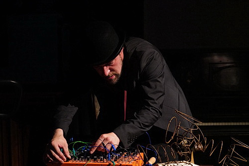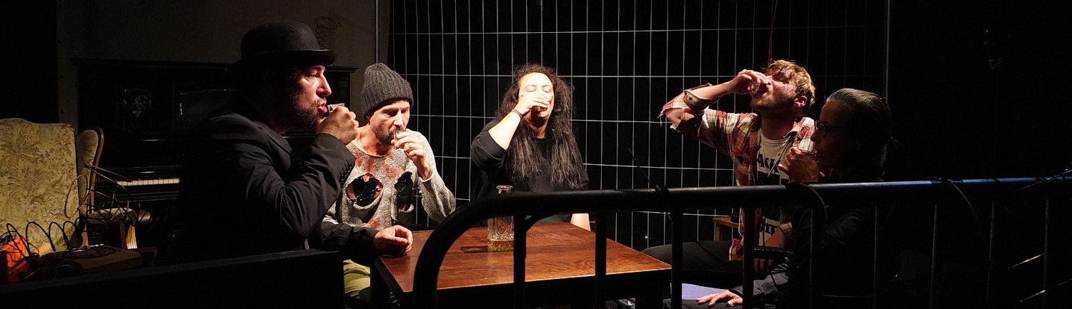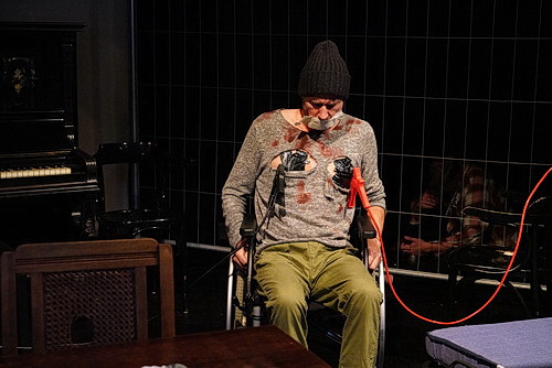 Vorne links an zwei Tischen sitzen Dominik Hertrich, heute als Kassierer, und Bombosch wie gewohnt als Raymond Papadopoulos, der Theaterkettenbesitzer. Hinter den beiden Jens Dornheim, dem als Tom Markward offenbar übelst mitgespielt wurde. Jedenfalls sind beide Füße bandagiert, der Pullover ist zerrissen und blutdurchtränkt, darunter etwas, was zwei Elektroden sein könnten, an die Batteriekabel als Symbole von Stromkabeln geklemmt sind. Sein Mund ist verpflastert. Das sieht alles nicht so gut aus. Auch Alexander Kupsch, der hinter einem Bauzaun im Hintergrund mit Popcorn aus einem Fressnapf vor sich hinvegetiert, macht keinen wirklich besseren Eindruck. Und die großartige Rechtsanwältin für Urheberrecht, Kunstfreiheit und Zensur, Mara Böhm-Duvel, wird von einer zurzeit eher kleinlauten Katina Kamke verkörpert, die hinter der Bühnenabsperrung kauert. Rechts von ihr, nahezu unsichtbar, hockt wie gewohnt Stefan Bahl, der mit seiner Kamera das Bühnengeschehen einfängt. Die Gesamtsituation in dem Bau wirkt eher dystopisch, und entsprechend unfreundlich ist auch diesmal der Empfang. Die Gefahr lauert.