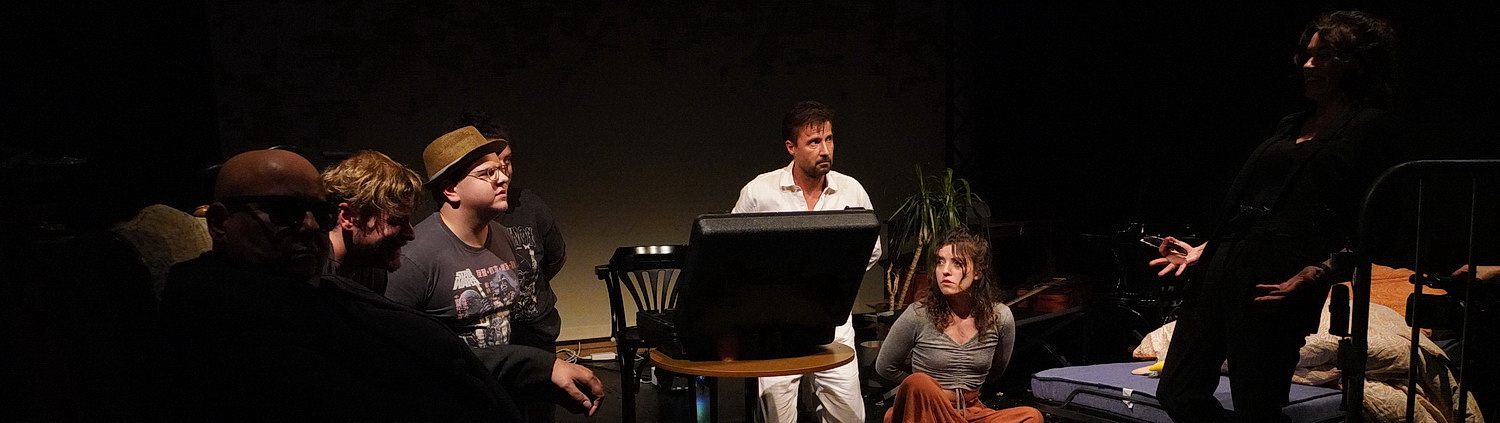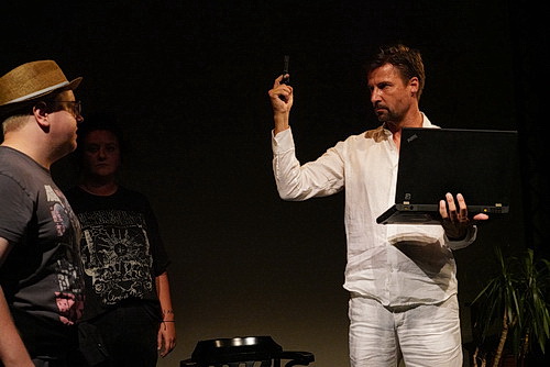 Tatsächlich hat Christina Binta als Bonnie Papadopoulos, Tochter des Theaterchefs, alle Hände voll zu tun, die Karten zu verkaufen und die Menschen mit Getränken zu versorgen. Trotzdem gelingt der pünktliche Beginn. Die Rückwand der Bühne ist komplett von einer Video-Leinwand bedeckt. Davor sitzt Dornheim als ehemaliger Klimaaktivist Tom Markward, ganz in Weiß gekleidet, zwischen zwei Pflanzen, an denen er herumzupft. Vor ihm ein Feldbett, auf dem Salamanca Kronenberg hockt, die wahrscheinlichste beste Schauspielerin der Welt, die bekanntlich an Krebs erkrankt ist und von Selina-Naomi Koenen verkörpert wird. Seitdem Bonnie sie mit Medikamenten versorgt hat, scheint es ihr wieder besser zu gehen. Dritter im Bunde ist Rick Maelstrom, einstige Wrestling-Legende, von deren sportlichen Fähigkeiten bei Alexander Kupsch wenig übriggeblieben ist. Schön, dass die drei Zeit für ein Liedchen finden. Auf die Melodie von Sound of Silence, dem wunderbaren Lied, das Paul Simon 1964 geschrieben hat, haben Hertrich und Binta, die auch in dieser Folge für die Textfassung zuständig sind, einen deutschen Text geschrieben, der die bisherigen Ereignisse noch einmal zusammenfasst – sehr zum Missfallen von Theaterchef Raymond Papadopoulos, dessen Beschimpfung allerdings nur aus dem Hintergrund zu hören ist, weil er sich gerade mit seiner Modelleisenbahn beschäftigt. Danny-Tristan Bombosch wird später noch zu seinem großen Auftritt kommen.