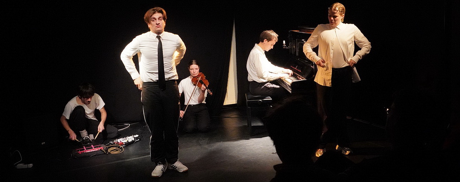 Nach dem Auftritt sputen die Musiker sich, die Bühne zu räumen. Schön, dass sie nicht gleich alle abreisen, sondern einige bleiben, um zu schauen, was die Truppe nach ihnen zeigt. Die zweite Aufführung wird in der Reihe InterInter des Labors 519 gestaltet. Mit der Reihe will Petry Menschen durch Musik, Tanz und andere Künste verbinden. Es ist die neunte Veranstaltung dieser Art, bei der ein Ensemble zu einem bestimmten Thema zusammenfindet, das aus lokalen und internationalen Akteuren besteht. Das Thema entwickelt ein Kurator. Für heute übernimmt Francesco Matejcek die Rolle und wählt als Thema Stress and Relax. Genau wie er kommt Meret König vom Physical Theatre. Als internationaler Gast nimmt Filippos Raskovic aus Vilnius am Klavier Platz. Das Schlagzeug und die elektronische Musik übernimmt Daniel Ismaili. Geigerin Élise Rosenbaum wechselt zwischen Instrument und Physical Theatre. Es beginnt ein abwechslungsreiches Bewegungsspiel, das nicht nur Matejcek, König und Rosenbaum in Atem hält. Auch Raskovic wird an der Klaviatur wie Ismaili an seinen Instrumenten mächtig gefordert, was Durchhaltewillen und Tempo angeht. Eindrucksvoll, wenn Rosenbaum sich mit der Geige in die Gemengelage der Körperlichkeit einmischt. Die Phasen der Erholung werden zunehmend kürzer, die Zwischenräume der Begegnungen wechseln zwischen verfehlter und verunglückter Beziehung. Die große Kunst des Auftritts liegt weniger im Können der Akteure, sondern darin, dass hier eine knappe Stunde lang improvisiert wird. Wenn Rosenbaum am Ende die Beteiligten von der Bühne fiedelt und schließlich reglos auf dem Boden liegt, wunderbar eingeleuchtet von Christian Freund, ist das Publikum hingerissen.