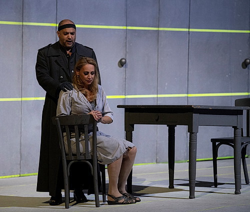 Was 1989 als innovative Provo­kation empfunden wurde und für Kontro­versen gesorgt hat, ist nach zahlreichen Wieder­auf­nahmen mittler­weile zum Kult geworden. Angesichts der Weltlage könnte die Insze­nierung aktueller kaum sein. Einst als engagierte Gesell­schafts­kritik beklatscht bis belächelt, zeichnet sie ein überzeu­gendes Bild der Gegenwart, mit all seinen irritie­renden Abgründen. Wenn beim Triumph­marsch die Führungs­kräfte der Rüstungs­in­dustrie in Elefan­ten­kos­tümen einmar­schieren, weiß man um die aktuellen Aktien­kurse der Rüstungs­kon­zerne. Wenn die Krieger­witwen ihre Kinder dem nächsten Krieg opfern, weiß man um die Indok­tri­nation der Kinder in Russland. Sieht man das Geleit der Kriegs­ver­sehrten, so hat man die TV-Bilder der verstüm­melten ukrai­ni­schen Soldaten im Kopf. Ob Hilsdorf selbst daran gedacht hat, dass seine schonungslose Regie­arbeit nach 36 Jahren einmal Realität werden könnte? Die Zuschauer im gut gefüllten Essener Haus scheinen von seiner Inter­pre­tation gefesselt, die vor allem die psycho­lo­gi­schen Abgründe des Aida-Stoffes heraus­ar­beitet. Die Insze­nierung ist nicht nur unglaublich gegen­wärtig, sondern immer noch ausge­sprochen anspruchsvoll und berückend ästhe­tisch. Die einzig­artige Perso­nen­regie von Hilsdorf setzt Maßstäbe. Ein Spagat zwischen monumen­talem Pomp und kammer­spiel­ar­tiger, mensch­licher Innigkeit. Johannes Leiacker hat dafür einen komplexen Bühnenraum entworfen, in dem Bühnen­auf­bauten, Theater­pro­spekte und Projek­tionen eine ausge­wogene, spannungs­ge­ladene Mischung ergeben. Es entstehen wunderbare Illusi­ons­räume, die einfach nur faszi­nieren und in denen man sich verlieren kann. Nach Jahrzehnten immer noch unfassbar beein­dru­ckend ist der neonkon­tu­rierte Unend­lich­tunnel als gemein­sames Grab von Radames und Aida im letzten Akt. Allein die Licht­regie bleibt unver­gleichlich preis­ver­dächtig. Die konge­niale Zusam­men­arbeit von Regie und Bühnen­bildner ist aber nur ein Aspekt der Wieder­auf­nahme in Essen, über die es zu berichten lohnt. Im Mittel­punkt der Produktion steht die Gesamt­be­spielung des Zuschau­er­raums. Die Chöre singen vom dritten Rang. Posaunen und Trompeten erschallen aus dem zweiten Balkon. Was damals wie heute für ein gigan­ti­sches Klang­er­lebnis sorgt, hat in Essen und darüber hinaus seit 1989 Schule gemacht. So intensiv und eindrucksvoll wie in dieser Aida hat man Oper aber selten gehört. Und der ganz beson­deren Faszi­nation vermag man sich einfach nicht zu entziehen. Die akustische 360-Grad-Bespielung erfordert von den Dirigenten ein hohes Maß an Koordi­nation. Die Dirigenten der letzten Jahrzehnte, von Ajmone-Marsan über Hauschild bis hin zu Soltész waren der Aufgabe gewachsen. Unter der aktuellen Leitung von General­mu­sik­di­rektor Sanguineti scheint das Zusam­men­spiel etwas weniger ausge­wogen und abgestimmt.