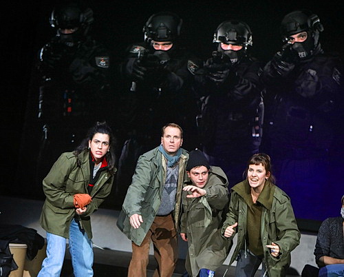 Die Zuschauer allerdings zeigen sich angesichts des technischen Aufwands und der darstellerischen Auftritte begeistert. Anna Bardavelidze spielt sehr überzeugend die Essensausfahrerin Adile, der die Wohnung genommen wird. Von der Ungläubigkeit, ihre Wohnung verlieren zu können, weil es höhergeordnete kapitalistische Interessen gibt, die ihr das Wohnrecht nehmen, bis zum Schritt in den Widerstand stimmt hier alles. Ebenso wie Rentner Grube, der sich als Stadtführer noch ein paar Euro dazuverdient. Jan Pröhl gibt einen der besten Momente, wenn er von der Geschichte der Roten Ruhrarmee erzählt. Wenige Minuten, die unter die Haut gehen. Trixi Strobel braucht eine Weile, um von der Tochter einer reichen Bauunternehmerin glaubwürdig in den Widerstand zu wechseln. Das ist ein bisschen zu sehr in Hollywood abgeschaut, funktioniert aber letztlich dank ihrer stringenten Darstellung. Ihr Gender-Gequatsche allerdings ist überflüssig und macht damit auch die „YouTube-Videos“ unglaubwürdig bis abschreckend. Dennis Bodenbinder wirkt im Haushalt der Haussmanns noch ein wenig steif, ehe er als Hacker Perry geradezu entfesselt „auf der Straße“ respektive am Computer kämpft. Stefan Migge sollte sich eindeutig für die nächste Oberbürgermeisterwahl in Essen aufstellen lassen. Als OB Kühn hat er den Politikerhabitus bis in den letzten Winkel abgeschaut. Janina Sachau ist die geborene Zynikerin und damit in der Rolle der Investorin van Velt ideal besetzt. Die Bauunternehmerin Haussmann ist eine schwierige Rolle, auch, weil bei ihr ein paar Konflikte zu viel abgeladen werden. Dafür macht Laura Sundermann ihre Sache sehr gut. Philipp Noack schließlich entwickelt den Polizisten Reich vom Erfüllungsgehilfen zum Rechtsextremisten mit Bravour.