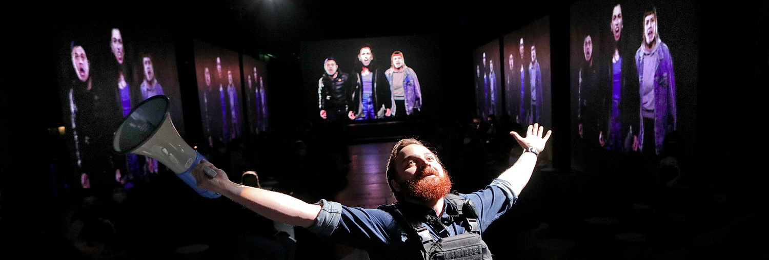 Unglücklicherweise passieren zwei Dinge. Hätte man dem Bürgermeister seine „Essener und Essenerinnen“ noch als Satire abnehmen können, müssen die übrigen Darsteller dann auch noch ihre Gender-Geschwurbel-(Un-)Kenntnisse zu Gehör bringen. Traurig genug, dass junge Darsteller den Bildungsbankrott von Schulen und Hochschulen demonstrieren, zumindest wenn es um die deutsche Sprache geht, schlimmer vielleicht, dass sie das nicht einmal reflektieren. Aber um Reflexion geht es an diesem Abend ohnehin am allerwenigsten. Anstatt sich auf das starke Thema in ihrem Stück AufRuhr zu beschränken, kommen die Theatermacher auf die Idee, das Geschehen zu „bereichern“, indem sie echte „Aktivisten“ in Einspielern zu Wort kommen lassen. Und ab hier wird es unerträglich.