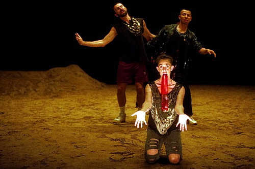 In den Projek­tionen werden zahlreiche Metamor­phosen als Bilder wechselnder Macht­ver­hält­nisse gezeigt, ehe es auf die eigent­liche Bühne geht. Acht Tänzer bewegen sich langsam und wellen­förmig von hinten nach vorn, während der Klang, für den Christian Müller zuständig ist, von einer eher sphäri­schen Woge zunehmend zu rhyth­mi­schen Trommel­klängen wechselt. Zwischen­zeitlich gibt es auf dem Sandhügel besagte Soli. Immer wieder taucht in den Tanzbe­we­gungen das Jesus-Motiv auf: Der Heiland hält die rechte Hand erhoben, während die linke auf dem Herzen ruht. Zwischen­zeitlich darf auch Maria mit einem Schal um den Kopf erscheinen. Der zweite Teil, der eher in schlep­penden Bewegungen vonstat­tengeht, mündet schließlich in der tatsäch­lichen Gefahr der Wüste. Schlangen. Hier darge­stellt von einem künst­lichen Exemplar, das die Tänzer bei Berührung zu konvul­si­vi­schen Zuckungen auf dem Boden veran­lasst. Beim Licht hält Jimenez das Publikum weitest­gehend von Überra­schungen fern, wechselt vom Halb- ins Viertel­dunkel, mal auch ins Rötliche. Zum Ende des zweiten Teils erlischt es.
