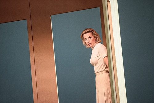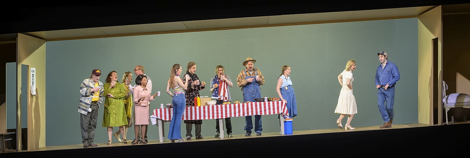 Sieht man die „Reduktion der filmi­schen Mittel“ bei Lars von Trier als ein Fenster zu einer neuen Ästhetik, spürt man bei Schramm davon nichts. Der hat auf seiner Bühne erst mal nichts, später eine Rampe, die mit schlecht verar­bei­teten Sperr­holz­platten in einzelne Abteile aufge­gliedert ist. Da gibt es kein reduce to the max, da bleibt die Fantasie des Theaters außen vor. Ähnlich verhält es sich mit den Kostümen. Man braucht den Film nicht gesehen zu haben, um zu erkennen, dass die Qualität der Bekleidung am untersten Niveau ausge­richtet ist. Und das hat nichts damit zu tun, dass es sich hier um die armen Bewohner eines Dorfes handelt. Lavinia Dames in einen Falten­keller-Rock mit weißem Pulli zu kleiden, das macht jemand, der beim Textil-Discounter einkauft und keine eigene Schnei­derei zur Verfügung hat. Auch Hermann kocht auf kleiner Flamme, aus musika­li­scher Sicht bleibt ihm auch kaum eine andere Wahl. Eine Verge­wal­tigung auf der Bühne zu zeigen, bei der der Rock unten bleibt, erreicht dann doch die Dimension des Nicht-mehr-sehen-Wollens. Ansonsten arbeitet er auf den großen Schluss­effekt hin. Der gelingt ihm als Theater­zauber, wie man ihn im Stadt­theater erwartet. Allmählich fragt man sich, ob in Opern­häusern eigentlich das Publikum noch ernst­ge­nommen wird, das an diesem Abend immerhin wieder die Reihen füllt.