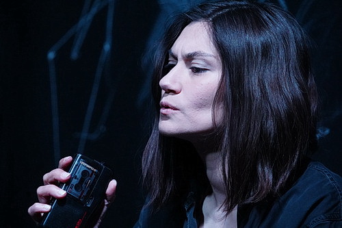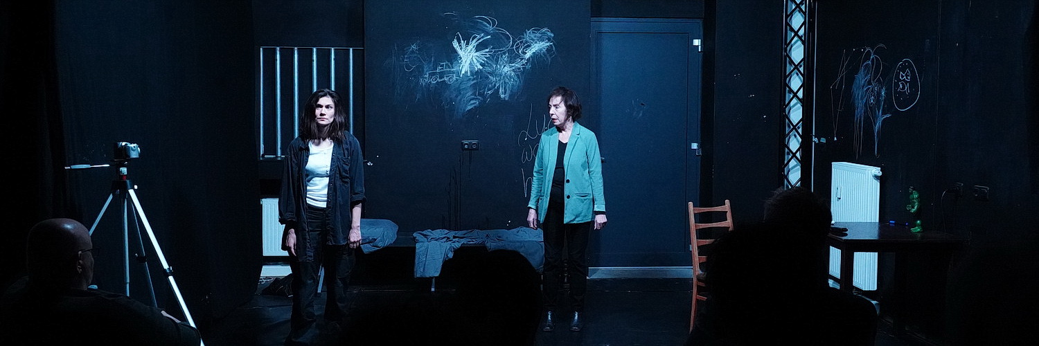 Ein Epitaph ist eine Grabinschrift oder eine Gedenktafel mit Inschrift für einen Verstorbenen an einer Kirchenwand oder einem Pfeiler. Und es ist der Titel des etwa einstündigen Stücks, das Hertrich und Münter geschrieben haben. Es war einmal in Amerika … Muss das sein? Ja. Denn die Vorstellung, dass so etwas in Deutschland passieren könnte, ist zumindest bis heute glücklicherweise doch zu verwegen. Hertrich verantwortet Regie und Bühnenbild. Auf den ersten Blick mutet die Bühne wie eine Gefängniszelle an. Er taucht sie in gleißendes, unbarmherziges Licht. Eine Pritsche, ein Tisch, ein Stuhl. Etwas irritierend eine Kamera, die auf die Situation gerichtet ist. Darin Lucy in einem Kostüm, das ganz entfernt an die Bekleidung eines Häftlings erinnern könnte. Im Verlauf ihres Monologs, teilweise in ein Diktiergerät gesprochen, stellt sich heraus, dass ihr Sohn auf dem Parkplatz eines Supermarktes erschossen wurde und der Täter entkam. Lucy ist von dem Gedanken an Rache besessen. Ein erster Versuch schlug fehl, als Lucy ihn fand. Und wie jetzt weiter? Sie kann dem Raum, in dem sie unter unwürdigen Bedingungen festsitzt, offenbar nicht entfliehen. In ihrer Verzweiflung kritzelt sie mit Kreide an die schwarzen Wände.