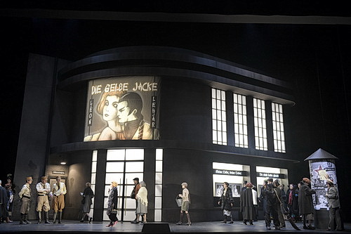 Wenn man also Lehár nicht traut und Angst davor hat, dass es auf der Bühne allzu gefühlvoll und nicht immer tiefgründig genug zugehen könnte, muss gepuscht werden: So findet in Essen die China-Revue Die gelbe Jacke als Gastspiel des Berliner Metropoltheaters Eingang in die Handlung des lächelnden Landes, wobei die Figuren mit zwei Namen auftreten. Nicht genug damit: Onkel Chang tritt auch noch als Gauleiter auf. Der Chor flankiert das Ganze als Zuschauer und es kommt zu braun gefärbten Störungen mit wilden Prügelattacken. Selbst Prinz Sou-Chong alias Pedro wird nach seinem Ohrwurm Dein ist mein ganzes Herz grob abgeführt. Am Ende ziert die von Lukas Kretschmer durchaus eindrucksvolle Theaterfassade neue, mit den geschwärzten Namen der jüdischen Librettisten versehene Plakate, die jetzt zum Land des Lächelns einladen. Große Hakenkreuzfahnen zieren die Mauern.