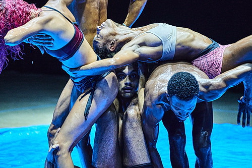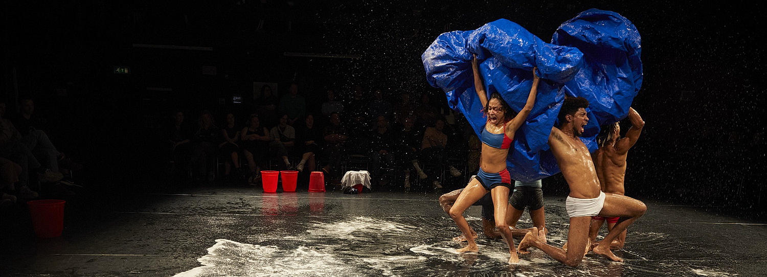 Nachfol­gende Konstel­la­tionen, in denen sich die Tänzer immer wieder neu aufstellen, um einen der ihren durch ihre Mitte flutschen zu lassen, lassen die einen an einen Geburts­vorgang, andere an Geldwäsche denken. Glück­li­cher­weise sind Festle­gungen nicht erfor­derlich, weil die Tänzer in ihren Badehosen und Bikinis allein perfor­mativ überzeugen. Und so braucht sich der Zuschauer auch nicht darum zu kümmern, dass „reale Handlungen der Reinigung zu einer körper­lichen und poeti­schen Erfahrung mit weitrei­chender histo­risch-politi­schen Bedeutung“ stili­siert werden. Tatsächlich beein­druckt, wie die Akteure beginnen, Schaum zu schlagen und damit nach und nach den Körper eines Tänzers bedecken. Einge­bungen wird das in tänze­rische Einlagen, die mitunter artis­tisch wirken. Dass auch mit der Bauplane noch physi­ka­lisch inter­es­sante Wasser­ef­fekte erzielt werden, berei­chert den Abend.