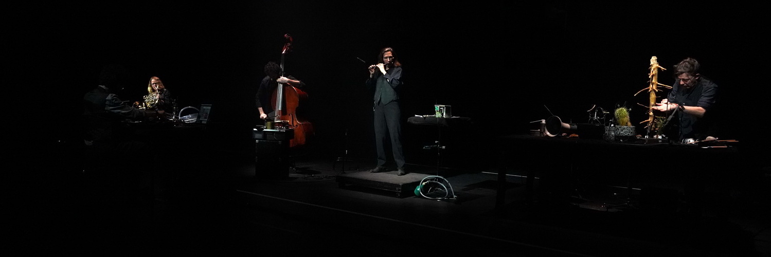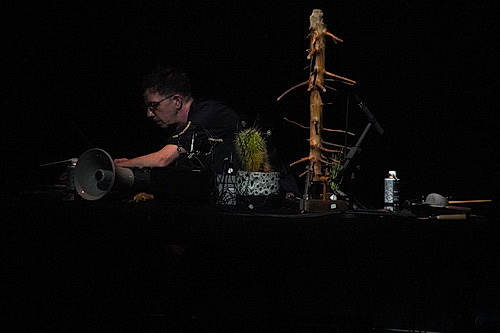Die Musiker betreten die Bühne und geraten in Spotlights. Viel mehr Licht gibt es nicht, wenn nicht gerade die Installationen ins Visier geraten. Wer die Instrumente sieht, gerät ins Grübeln. Die Musiker selbst denken erst gar nicht daran zu verraten, auf welchen abenteuerlichen Geräten sie da Klänge und Geräusche erzeugen. Sie orientieren sich bei den Kategorien an ihren herkömmlichen Instrumenten. Und da sitzt Kurator Florentin Ginot am Kontrabass, Helen Bledsoe setzt sich mit verschiedenen Flöten auseinander, Dirk Rothbrust versorgt das Schlagzeug, Christine Chapman ist zwischendurch mal am Horn zu erleben und Stefan Prins nimmt unverständlicherweise mit dem Rücken zum Publikum am Computer Platz. Das ist allerdings nur die halbe Wahrheit. Unter der Vielzahl an Klangquellen, die auf den Tischen und Pulten aufgebaut sind, kann der Laie gerade mal einen Plastikschlauch und ein Megafon, möglicherweise noch einen Kaktus identifizieren. Statt Erklärungen werden die Musiker später die Möglichkeit zum Gespräch und zur Besichtigung anbieten.