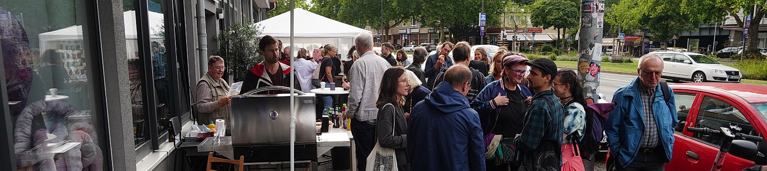 An dem Verkehrsknotenpunkt liegt das Rabbit-Hole-Theater, das auch in diesem Jahr wieder sein Sommerfest veranstaltet. Es begann bereits am Vortag – mit starken Regengüssen, wie Dominik Hertrich, neben Christian Freund und Jens Dornheim Mitinhaber des kleinen Theaters, erzählt. Bei der verspäteten Ankunft hört man von außen noch den Auftritt von Frollein und Karim the Dream, der Versuch, in das Theater zu kommen, scheitert, weil der Raum wirklich bis auf den letzten Zentimeter gefüllt ist. Das ist nur begrenzt zu bedauern, kommt man so doch schon mal in den Genuss einer ersten Festival-Bratwurst, die von hervorragender Qualität ist, und hat einen Platz in der ersten Reihe, als sich der Außenauftritt von Lisa Birnkott anschließt. Aus einem Treppenhaus heraus mit der Außenwelt via Mikrofon verbunden, deklamiert die in Leverkusen geborene, heute in Köln lebende Schauspielerin einen Frauenmonolog von William Shakespeare auf Deutsch. Es ist der erste Teil ihres Auftritts, wie sich später herausstellen wird.