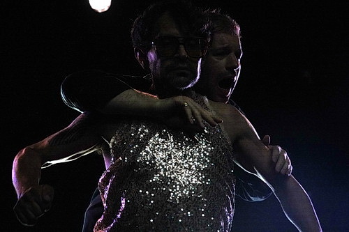Dann wechseln Musik und Stimmung. Klug gewählt, weil vertrautes Gefühl vermittelnd, erklingt Maurice Ravels Bolero. Auch wenn Touzeau schon aus Platzgründen hier auf große Figuren verzichtet, wird doch mit jeder Bewegung die athletische Kraft und Anmut des Balletttänzers sichtbar. Inzwischen hat er den Pelz abgelegt. Darunter kommen ein bodenlanger Rock und ein Pailletten-Oberteil zum Vorschein, ein Kostüm, das die schwüle Erotik des Boleros unterstreicht. Huy beschränkt sich nun auf Vokalisen. Die Kommunikation der beiden, die sich in Distanz oder – beängstigender – Nähe ausdrückt, ist fesselnd. Es ist unglaublich, wie es den beiden gelingt, eine dichte Atmosphäre aufzubauen, die sich wie eine Zwischensphäre auf der Bühne zu materialisieren scheint. Mit einer letzten Wiederholung des Eingangstextes, die in einem Aufschrei endet, kann sich endlich auch der tobende Applaus entladen.