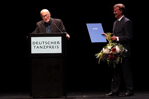 1975 griff der studierte Tänzer Gert Weigelt erstmals beruflich zur Kamera und hat seitdem die Tanzfo­to­grafie mit Porträts, insze­nierten Aufnahmen und Bühnen­fo­to­grafien geprägt. Der Dachverband Tanz Deutschland ehrt ihn deshalb mit dem Deutschen Tanzpreis 2019. Ein gutes Signal, zeigt diese Geste doch deutlich die Verbun­denheit der Vergäng­lichkeit in der Bewegung mit der Notwen­digkeit des festge­hal­tenen Bildes. Wie bekannt wären wohl die Arbeiten von Martin Schläpfer geworden, die Weigelt über zehn Jahre fotogra­fisch in Kampagnen und Bühnen­fo­to­grafie dokumen­tiert und in der breiten Öffent­lichkeit gezeigt hat? Was bekämen wir wohl heute noch von der Person Pina Bauschs zu sehen, hätte Weigelt sie nicht hartnäckig 30 Jahre lang immer wieder porträ­tiert? Fragen, die keiner beant­worten kann, aber die Bilder existieren. Und sie dokumen­tieren nicht nur, sondern prägen auch und gerade in den eigenen Arbeiten Weigelts eine Ästhetik, die bis heute Gültigkeit hat. Thomas Thorausch, Stell­ver­tre­tender Leiter am Deutschen Tanzarchiv Köln, befasst sich in seiner Laudatio auch mit diesen Fragen. Erfri­schend, kurz, abwechs­lungs­reich, aber auch nachdenklich stimmend hält er seine Dankesrede an einen Mann, dem der Tanz mindestens in Deutschland viel zu verdanken hat. Auch Gert Weigelt hält sich nur kurz am Rednerpult auf, um den Menschen zu danken, ohne die sein Erfolg kaum denkbar gewesen wäre. Ob sein Mentor, der Choreograf und Fotograf Hans van Manen, die Choreo­grafen, mit denen er zusam­men­ar­beitete oder die Auftrag­geber, die ihm die freie künst­le­rische Hand ließen, die er für seine Entwicklung brauchte – sie alle finden Erwähnung, ohne in endlose Tiraden zu verfallen. Und schließlich geht es dem 76-Jährigen doch nahe, dass er diesen Preis für sein Lebenswerk allein entge­gen­nehmen muss. Und so schickt er abschließend einen Gruß an seine Frau, die Tänzerin Sighilt Pahl, die eben erst eine schwere Lungen­ent­zündung überstanden hat. Zum Ende der Preis­ver­leihung zeigt Weigelt dann noch das viermi­nütige Video-Kunstwerk Pinatz, eine gelungene Hommage an Pina Bausch.