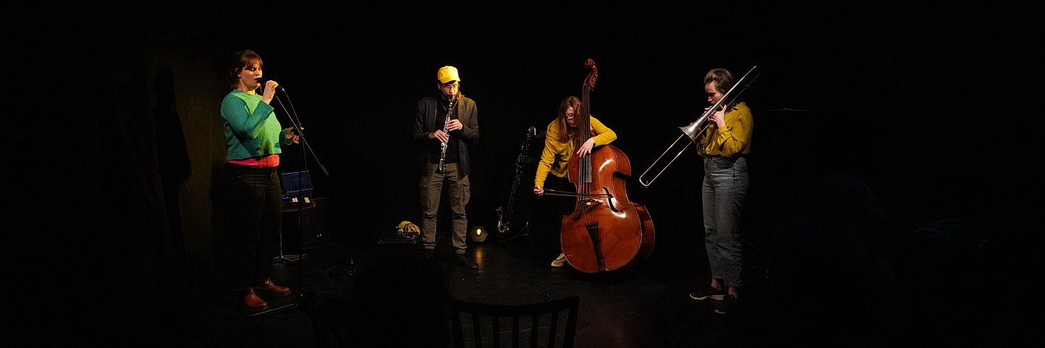 Damit scheiden Improvisationen im Orchester quasi aus, wird hier – gerade im klassischen Betrieb – doch eher so etwas wie Werktreue zum bestehenden Repertoire verlangt. Da wird Improvisation schnell zum fehlerhaften Spiel abqualifizert. Ganz anders am heutigen Abend, den Petry unter dem Titel Unterbrechung veranstaltet. Eingeladen hat sie dazu drei weitere Musiker. Hanna Schörken studierte zunächst englische und französische Literatur in Bonn, verlegte sich aber schnell auf die frei improvisierte Musik, setzte ihre Studien in Holland, Osnabrück, Lyon und Köln fort. Heute arbeitet sie als Sängerin im Bereich der frei improvisierten Musik, Jazz und elektronischer Musik. Mag ein Kontrabass und Stimme noch zusammengehen, wird es schon bei der Posaune ungewöhnlich. Maria Trautmann studierte Jazz-Posaune an der Folkwang-Universität der Künste in Essen. Ebenfalls an der Folkwang-Uni erwarb Robert Beck sein Wissen um das Spiel der Klarinette. Sein Masterstudium absolvierte er in Berlin. Seither beschäftigt er sich auch mit der elektronischen Musik. Ein ungewöhnliches Quartett, das hier heute Abend mit einer Improvisation antritt. Und vielleicht noch ungewöhnlicher: Die vier haben zuvor nicht geprobt. Beck haben die Frauen erst an diesem Abend kennengelernt.