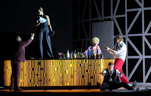 Nicht weniger überzeugend wissen sich auch die anderen Mitglieder des Ensembles zu präsentieren. Angela Vallone beherrscht die anspruchsvollen stimmlichen Voraussetzungen der hohen Dame Livia bestens und kann darstellerisch durch eine hinreichende Prise arroganten Anspruchs ihren verliebten Milford Arespingh lustvoll auf die Palme bringen. Der wird vom jungen Bariton Iurii Samoilov gegeben, der in englischem Outfit mit Melone ebenso bella figura macht wie in einem späteren Moment in der Begegnung mit seiner Angebeteten in Unterhose.
