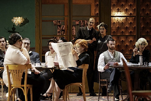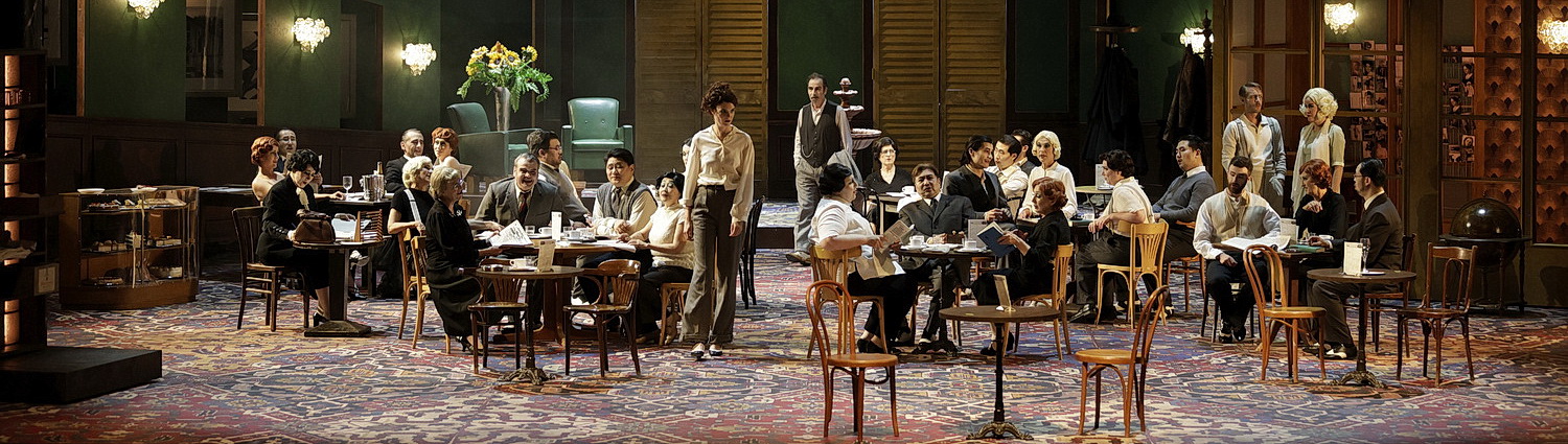 Die Glanz­taten des Freiburger Theater-Abends damit, im Wesent­lichen, aufge­listet. Und der Rest? – Führt in Problem­zonen, in Engpässe. Hausge­machte, selbst­ver­schuldete samt und sonders. In seiner letzten Freiburger Insze­nierung bemüht Carp noch einmal gute alte Stadt­theater-Konvention. Sein Kaffeehaus, das er sich von Kaspar Zwimpfer hat bauen lassen, wird bevölkert vom Personal jener Jahre. Die Insze­nierung läuft in die histo­ri­sie­rende Falle. Carp und seine Kostüm­bild­nerin Su Bühler wollen nachstellen. Ein Schlüs­selreiz. Liest, hört man im deutschen Stadt­theater von einem Stück der sagen­um­wo­benen 1920-er Jahre – sofort ist der Bubikopf im Spiel. So auch hier. Und, das wirkt am schwer­wie­gendsten, bewirkt struk­tu­relle Lange­weile, die Musik, die Carp aus dem Graben spielen lässt, verliert so ihre Autonomie, hat die undankbare Aufgabe, das Geschehen auf der Bühne zu klang­be­bildern. Ein Bären­dienst an Koffler. Auch in Freiburg scheint der Tag noch fern, da die Musik sich zeigen darf, da sie, die doch die Haupt­dar­stel­lerin ist, selbst auf die Bühne darf. Hinzu­kommt: Ein schwaches Libretto ohne Fallhöhe, verleitet Carp dazu, das Klamaukige immer noch mehr zu bedienen. Dahinter auch falscher Respekt.  Alles-durch‑M.O.W.-Librettist Alfred Rust, über den man ansonsten nichts weiß, hatte Koffler einen Parade-Theatertext der Neuen Sachlichkeit geliefert. Liebe, die Ordnung der Geschlechter, delegiert an ein Partner­schafts­an­bah­nungsbüro. Eine Flachheit, über die einzig der silberne Sopran von Natasha Sallès, erhaben ist. Sallès, eine urkomische Begabung, wird nach Vorstel­lungs­schluss aus dem Ensemble veabschiedet. Intendant Carp verrät leider nicht wohin. Hätte man gern gewusst.