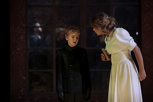 Hilfreich ist natürlich, wenn man bei solchem Aufwand über ein entspre­chendes Ensemble verfügt, dass die Bemühungen mitträgt. Und Intendant Carp kann stolz auf seine Sänger sein. Ist er auch, wie er unumwunden zugibt. Die Stimmen sind überwäl­tigend. Wirkt Joshua Kohl als Erzähler rollen­be­dingt noch kaum überzeugend, darf er seine Stärken als Peter Quint voll ausspielen und begeistert stimmlich wie darstel­le­risch. Judith Braun intoniert Ms Grose tadellos, und ihrem Habitus zufolge möchte man die Haushäl­terin gleich einstellen. Solch gutes Personal findet man eben selten. Die Gefühls­ein­brüche und Gewis­sens­bisse, die zuneh­mende Hilflo­sigkeit der Gouver­nante verkörpert Solen Manguené überzeugend intensiv. Die großen stimm­lichen Anfor­de­rungen der Rolle hat sie eher nebenbei im Griff, und beim Piano am Ende vergessen die Zuschauer im Saal das Atmen. Ebenso anspruchsvoll, wenn auch in der kleineren Rolle, zeigt sich Inga Schäfer als höchst attraktive Miss Jessel. Bei dieser Stimme aller­dings geriete die Körper­lichkeit schnell in Verges­senheit, wenn Carp nicht auch mit diesem Pfund wucherte und der toten Gouver­nante viel Erotik mitgibt. Die Profes­sio­na­lität der Berufs­sänger wird aller­dings von den Kindern noch überboten. Britten hat sich bei den Anfor­de­rungen an die Kinder nicht zurück­ge­halten. Aber Thomas Heinen als Miles und Katharina Bierweiler als Flora lassen sich davon nicht beein­drucken und singen makellos, was sie neben ihrem Schüler­leben eingeübt haben. Der einzige Kinder­bonus kommt, wie gesagt, von Carp, der die beiden zum Still­stand beim Singen verdonnert. Einfach grandios, was es an diesem Abend auf die Ohren gibt.