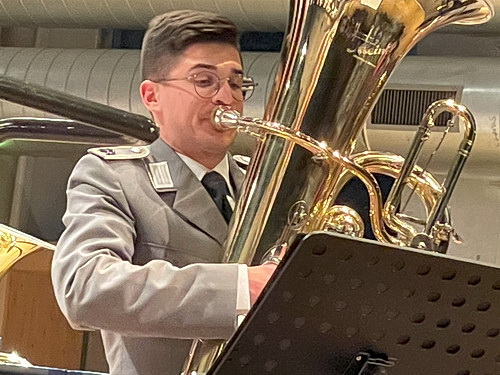 Nach dieser Verschnaufpause folgt das nächste Highlight. Der Moderator des Abends, Alexander Henn, von Haus aus Klarinettist und an diesem Abend vor allem an der Bassklarinette im Einsatz, führt mit viel Charme und erfrischenden Humor durch das Programm. Die direkte Frage an das Publikum, welches das Instrument des Jahres 2024 sei, wurde sofort und korrekt beantwortet: Die Tuba. Selten kommt das tiefe und gewichtige Instrument in den Genuss eines Solovortrags. Eine der bekanntesten Solostellen für eine Tuba ist das Erwachen des Drachen Fafner in Richard Wagners Oper Siegfried. Heute Abend steht das Concerto for Tuba and Wind Ensemble von Gary D. Ziek auf dem Programm. Ziek, Jahrgang 1960, ist ein amerikanischer Komponist, Musikpädagoge, Trompeter und Dirigent und studierte an der Indiana University of Pennsylvania in Indiana Trompete und Musikpädagogik. Heute ist er Professor für Trompete an der Emporia State University in Emporia, Kansas.