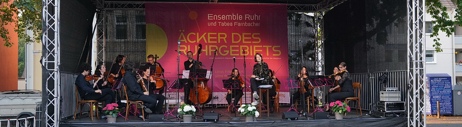 Anders als andere Orchester oder Ensembles hat das Ensemble Ruhr keine Scheu vor ungewöhnlichen Spielstätten. Altenheim, private Gärten, die Jahrhunderthalle Bochum oder auch mal auf Zeche Zollverein – das Ensemble zeigt keine Berührungsängste, allenfalls vor herkömmlichen Konzertsälen, vielleicht. Und so fiel es Barbara Wagner, der Geschäftsführerin des Ensembles, leicht, die Anfrage von Lammert nach einem Auftritt beim Nachbarschaftsfest zu bejahen. Nach der Uraufführung ihres neuen Programms Äcker des Ruhrgebiets einen Abend zuvor auf Zeche Zollverein konnte dem Ensemble eine weitere Aufführung sicher nicht schaden. Dass der Einladung zu diesem kleinen Fest bei bestem Wetter am Wochenende und bei „freiem Eintritt“ nur wenige Menschen folgen würden, damit war nicht zu rechnen. Das Ensemble lässt sich keinen Moment die Enttäuschung anmerken, dass vor der Bühne weniger Menschen als auf der Bühne sitzen. Das zeugt von wahrer Größe.