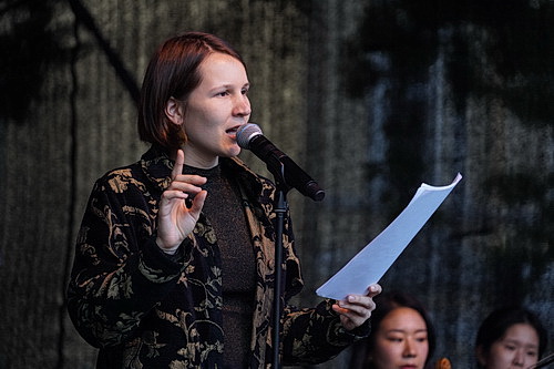 Das Ensemble Ruhr ist bekannt dafür, die Strukturen herkömmlicher Konzertformate aufzubrechen. Zu ihrem neuen Programm haben sie Tabea Farnbacher eingeladen, ihre Poetry-Slam-Texte in die klassische Musik einzubauen. Die Psychologin hat bereits in jungen Jahren Erfolge im Poetry Slam verzeichnen können. Jetzt steht die kleine Person still, bescheiden, mit freundlich zugewandtem Blick unter den Musikern neben der Bühne und wartet auf ihren Auftritt. Warum die Musiker sie ausgewählt haben, den Abend zu bereichern, wird kurz darauf deutlich. Das an diesem Abend zwölfköpfige Orchester unter der Leitung von Stefan Hempel beginnt mit einer Elegie von Giacomo Puccini, in die sich Farnbacher gleich mal wortgewaltig einmischt.