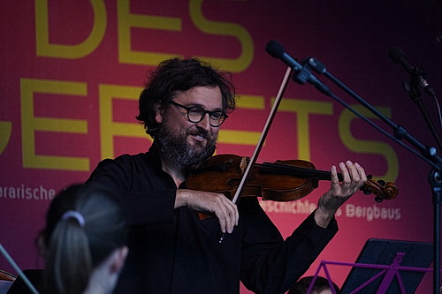 Währenddessen und zwischendurch erklingt Joseph Haydns Konzert Nr. 4 mit einem wunderbaren Solo von Stefan Hempel an der Geige. Anna Betzl-Reitmeier und Antje Weltzer-Pauls, die eine am Cello, die andere an der Geige, haben als Künstlerische Leiterinnen des Ensembles das Programm zusammengestellt und drehen mit Darius Milhauds Streichquartett Nr. 1 das Geschehen ins Dramatische. Worte und Musik finden mehr und mehr zusammen. Mit dem Impromptu opus 5, Nr. 5 und 6 von Jean Sibelius zieht das Ensemble die Hörer endgültig in einen Sog, der das Leben auf dem Platz in seinen Bann zieht. Allein die Kinder bleiben unbeeindruckt und setzen ihr lebhaftes Spiel fort. Allmählich entzieht sich der Platz jeder Wirklichkeit. In ihrem Zusammenspiel finden Farnbacher und das Ensemble Ruhr zu einem eigenen Atem, der den Platz beherrscht. Keiner stellt mehr die Frage, wie viele Zuschauer dem Konzert lauschen. Sondern Publikum, Poetin und Musiker verschmelzen. Das muss man mal erlebt haben.