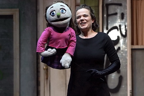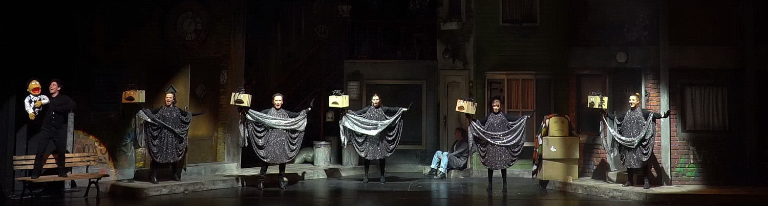 Im Musiktheater im Revier in Gelsenkirchen hat man neue Fördergelder akquirieren können, und seitdem gibt es dort auch Puppentheater für Erwachsene. Anstatt eigene Stücke zu entwickeln, greift man auf Avenue Q zurück, vielleicht, weil die Lizenzen billiger sind als die Honorare für einheimische Kräfte. Carsten Kirchmeier hat die Regie übernommen. Seine beste Idee dabei war wohl, Beata Kornatowska für die Ausstattung zu verpflichten. Denn ihr Bühnenbild einer Straßenszene in New York ist theatralisch dicht, bietet zahlreiche Möglichkeiten für Auf- und Abgänge, auch wenn diese nicht immer folgerichtig genutzt werden, und erinnert an so manche Schmuddelecke in New York. Die Puppen hat Birger Laube den Original-Figuren von Rick Lyons nachempfunden, um die Ähnlichkeiten zu Muppet Show und Sesamstraße nicht zu verlieren. Patrick Fuchs setzt die Szene in adäquates Licht ohne große Überraschungen. Auf Projektionen wird verzichtet.