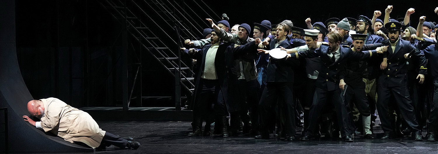 Auch die erotischen Konflikte werden deutlich gezeichnet, aber mit sensibler Dezenz, allenfalls durch einige androgyne Statisten aufgepeppt. Das alles spielt sich in der düsteren, einschüchternden Kulisse von Bühnenbildner Dirk Becker ab. Die Bühne teilt sich in zwei Ebenen, der spießbürgerlich harmlosen Kajüte des Kapitäns und einem monumentalen Schiffsraum, dessen Bullauge im Hintergrund an ein Tor zur Hölle erinnert.