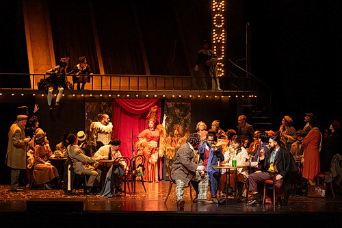 Die großen Massenszenen sind von der Regie perfekt durchchoreografiert. Nicht das kleinste Detail bleibt dem Zufall überlassen. Gläser und Flaschen sind mit Flüssigkeiten gefüllt und selbst die wie von echten Kellnern aufgetragenen Speisen vermag man im Zuschauerraum zu riechen. Ein gewaltiges Treiben, nicht nur auf der Bühne, sondern gefühlt mitten im Publikum. Die Unmittelbarkeit ist vielleicht die ganz besondere Stärke des Regiekonzepts.