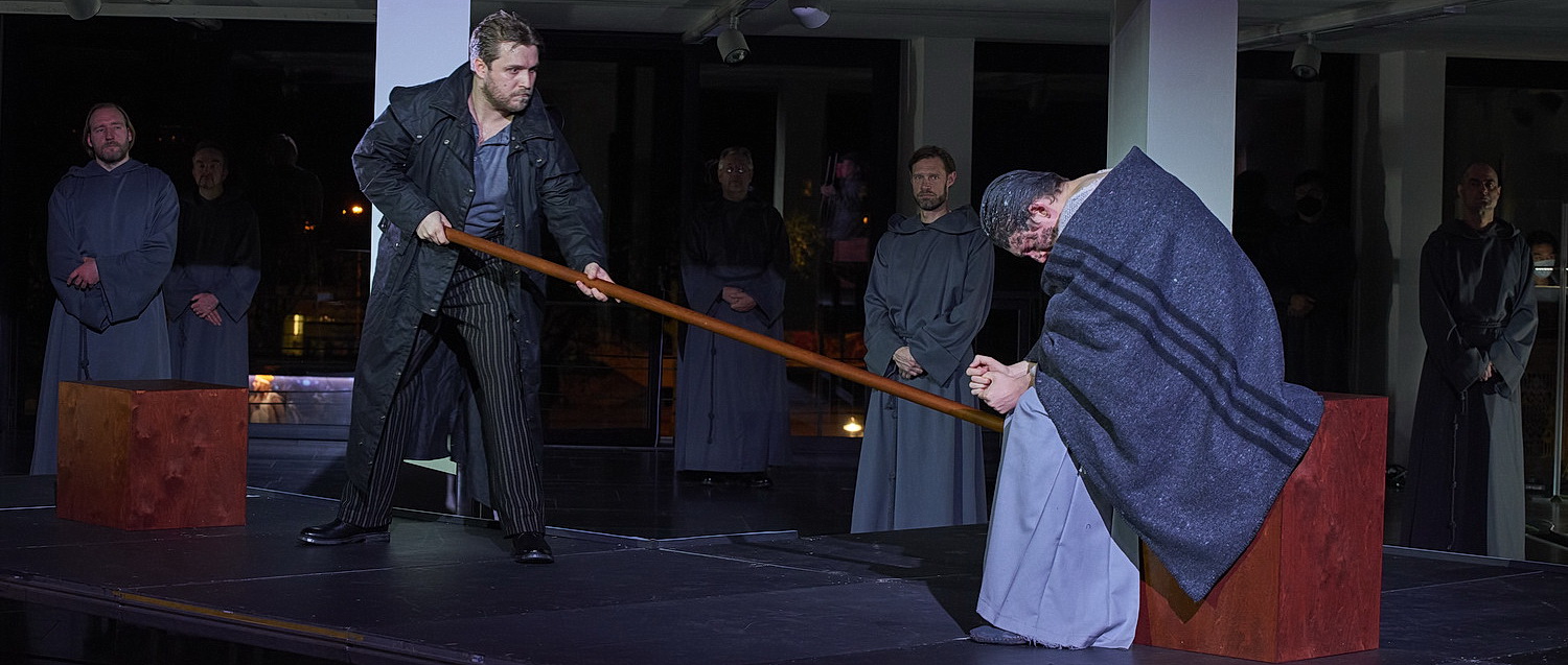 Ein Männerchor in Mönchskutten eröffnet das Spiel mit einem gregorianischen Choral. Sowohl das mit sieben Musikern sparsam besetzte Orchester als auch die auf vier Sänger beschränkte Besetzung deuten bereits Brittens Absicht an, mit extrem reduzierten Ausdrucksmitteln ein Maximum an inspirierter Wirkung zu erzielen. Dramatische theatralische Effekte spielen keine Rolle. Man agiert konzentriert, nahezu statisch in entschleunigtem Tempo und die Regie bleibt dem Libretto eng verhaftet. Auf aktualisierende Ambitionen oder auf Originalität getrimmte Effekte verzichten Carsten Kirchmeier und Kostümbildnerin Karin Gottschalk konsequent. Das trägt durchaus die 75-minütige Spieldauer, auch wenn der verheißungsvolle Schluss in dieser Machart wie von einer leicht frömmelnden und betulichen Patina überzogen wirkt.