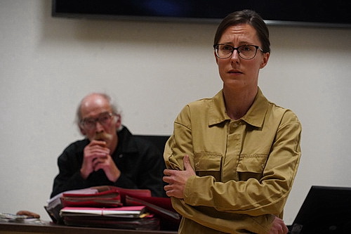 Der Schöffensaal im zweiten Obergeschoss des Justizzentrums könnte trotz hochwertiger Ausstattung nüchterner kaum sein. Stäbchenparkett, auf dem in U‑Form zweckmäßige Bänke und Stühle aufgestellt sind, ein überdimensionaler Monitor hinter der Richterbank. Einfarbige, schmucklose Wände. Das muss reichen, um eine Gerichtsverhandlung über die Bühne zu bringen. Ja, Theater gebe es auch bei Gericht genug, scherzt Kirsten, aber jetzt wird die Bühne für die Vergangenheit eröffnet. Am Fußende des Saals sind zu diesem Zweck vielleicht 40 Stühle aufgestellt. Angelika Heid-Schilling hat, der Idee der Entindividualisierung des Autors folgend, die Darsteller in unifarbene Overalls gesteckt. Schwarz für die Justiz, ein ironisches Weiß für die Angeklagten und lehmfarben sind die Kostüme der Zeugen. Nichts soll hier vom Wort ablenken, hat Weiss verlangt. Auch Danny-Tristan Bombosch lässt seine weniger als minimalistische Musik lediglich zu den Szenenwechseln erklingen.