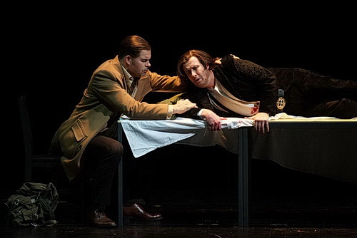 Weniger gelungen ist die Neuanordnung der einzelnen Szenen. Dass man die Oper mit dem Tod des Marchese di Calatrava beginnt – ein Schuss löst sich versehentlich aus Alvaros Waffe – und dann erst die schicksalshafte, treibende Musik der Potpourri- Ouvertüre einsetzt, macht noch Sinn und ist schon öfters vorgekommen. Wie Schulz dabei das Verhältnis von Leonora zu ihrem Bruder Don Carlo psychologisch aufdröselt, ist beachtenswert. Es folgt nach Plan die Szene in der Dorfschenke. Von dort springt Schulz direkt ins Feldlager, zumindest so lange, bis Don Carlos herausgefunden hat, dass sein vermeintlich guter Freund der Verführer der Tochter und Mörder des Vaters ist. Der erste Teil endet dann erstaunlicherweise mit einem Gespräch zwischen Padre Guardiano und Leonora. Ihre Arie und ihre Aufnahme durch die Mönche erfolgt ohne eine erkennbare Motivation nach der Pause. Der zweite Teil des Abends schwächelt ohnehin, weil der mit Kürzungen kleingehalten und zudem auch noch psychologisch überfrachtet wird. Das Schlussbild mit den drei toten Familienmitgliedern, die letztendlich alle durch einen versehentlichen Schuss getötet worden sind und nun gemeinsam am Tisch sitzen, wirkt an den Haaren herbeigezogen. Den besten Eindruck hinterlässt das Bild in der Dorfschenke, wo Schulz ganz fokussiert erzählt, wie die Diskriminierung von Fremden beginnt, wie man als Mitläufer schnell zum Täter werden kann. Hätte er dieses Format beibehalten, wäre diese Forza bestimmt spannender ausgefallen.