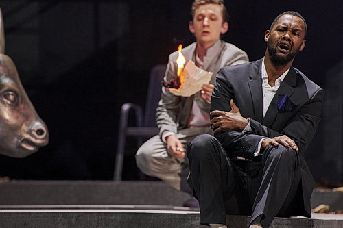 Links neben dem Haus ist die Skulptur eines stattlichen Bullen aufgestellt, wie man ihn von der Frankfurter Börse kennt. Vermutlich das Symbol für den Mechanismus des Kapitalismus als wirkliche Basis der EU. Im Schlussbild liegt der Stier auf der Seite, als wäre die Finanzkrise nicht gelöst. Desdemona, die ihn anfänglich mit einem Lappen poliert, schmiegt sich nun an ihn. Trost suchend. Es geht nobel zu im Haus Europa. Iago und Rodrigo bevorzugen das Golfspiel. Das Schöne am Golfspiel ist, dass man mit den Schlägern aufeinander eindreschen kann. Exakt das deuten die beiden Rivalen dann auch an.