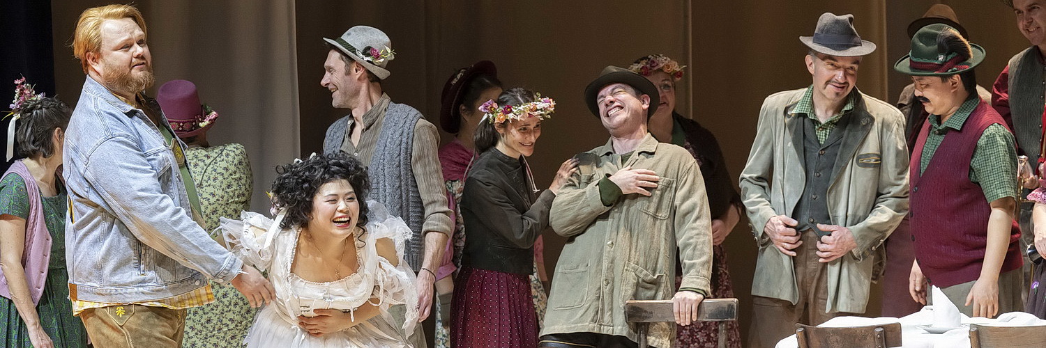 In der Titel­partie ist Kim in den lyrischen wie den expres­siven, von Enttäu­schung und Aufbe­gehren getra­genen Passagen eine vorzüg­liche Besetzung. Ihre vokale Qualität in der Arie Wie fremd und tot ist alles umher verweist schon jetzt auf große Steige­rungen in der nahen Zukunft. Der Tenor Martin Homrich verkörpert als ihr Pendant in der physi­schen Erscheinung den Hans eine Spur zu robust, zu selbst­be­wusst. Der Knecht trumpft von Beginn an wie der kommende Großbauer auf. Er trägt seine Potenz wie eine Trophäe vor sich her und mit lässiger Selbst­ver­ständ­lichkeit das Bären­kostüm, das ihm als Sieger in der Wette um denje­nigen zusteht, der die größte Menge an böhmi­schem Pils verträgt. Das robuste Moment prägt auch seine vokale Präsenz, leider auf Grund seines ungesunden Vibratos und seiner nuancen­armen Overdrive-Attitüde zum Nachteil von Stimme und Rolle.