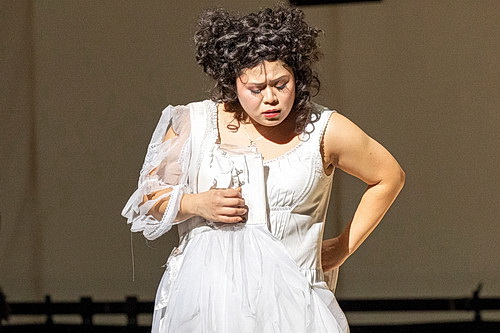 Stimmlich ist ihm der Wenzel Glagaus auf dem anspruchs­vollen Weg vom Stotterer zur sprachlich reifenden Seele so weit voraus, dass der Besucher sich wünschen könnte, Marie möge doch ihre Entscheidung noch einmal überdenken und an seinen lyrischen Quali­täten als Sänger ausrichten. Die zeigen sich noch einmal eindrucksvoll in der Inter­aktion mit der Esmeralda von Dongmin Lee. In der Rolle der Zirkus­tän­zerin sieht sie Kim, ihrer korea­ni­schen Gesangs­kol­legin, außer­or­dentlich ähnlich. Kein Wunder, dass Wenzel sich in der Erfüllung seiner Träume wähnt. Eine kluge Besetzungsregie.