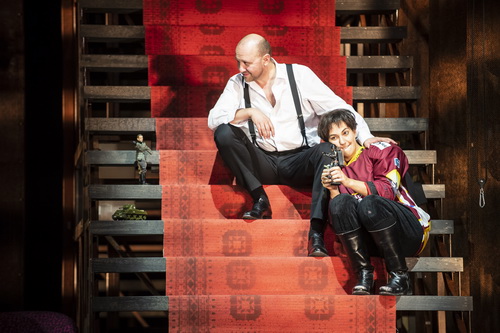 Modest Mussorgskis erster Wurf spielt ganz auf die Hauptfigur. Im Zentrum steht mit Boris Godunow ein Mann mit Machtgier aber ebenso großer Verunsicherung. Am Schluss wird der Herrscher seinen Ängsten erliegen und als gebrochene Figur tödlich zusammenbrechen. Das drückt sich auch in der Musik aus, die den Niedergang von Boris Godunow bereits im Prolog mit reichlich Bombast sowie sakralen Chorgesängen antizipiert und im Verlauf einen für diese Zeit kaum gehörten Sog entwickelt. Regisseur Matthias Hartmann findet für die stete Bedrohung eine passende Bildsprache und setzt vornehmlich auf die rudimentären Requisiten von Bühnenmeister Volker Hintermeier. Sechs modulare wie begehbare Metallkonstruktionen bilden den Rahmen. Die erweisen sich als probater Schachzug, um das in mehreren Bildern angelegte Volksdrama in eine Kathedrale, ein Kloster oder eine Schänke zu verwandeln. Peter Bandl illuminiert den Raum mit düsteren Braun- und Rottönen und transportiert damit eine sinistre Atmosphäre, wie man sie vom Film noir kennt. Ähnlich arbeitete Calixto Bieito 2017 für Sergei Prokofjews Der feurige Engel am Opernhaus Zürich.