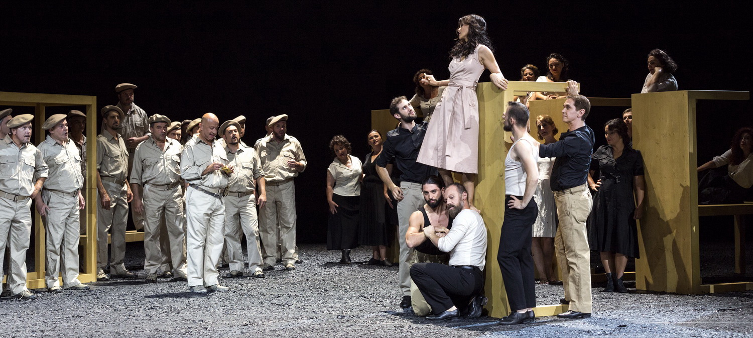 Ekaterina Sergeeva bekommt die Standard-Carmen-Perücke mit langem, schwarzem Haar übergestülpt, hat eine eigene Choreografie, die man auch im besten Fall kaum als lasziv bezeichnen kann, und lässt ihren voluminösen Sopran vor allem in den hohen Lagen erstrahlen. Aber sie ist von Anfang an dabei. Anders Sébastien Guèze. Der Tenor muss in den ersten beiden Akten ordentlich gegen die Aufregung kämpfen, einen überzeugenden Don José darzustellen. Dass es besser geht, zeigt er vor allem im vierten Akt. Da erklingt die Stimme frei und unbeschwert. Trotzdem bleibt er weit hinter einem wie immer eindrucksvollen Ildebrando D’Arcangelo als Escamillo zurück. Der Bass verleiht dem Stierkämpfer darstellerisch und vor allem stimmlich jene Heldenfigur, als die sie angelegt ist. Einmal mehr großes Kompliment. Als Micaëla bekommt Mary Feminear ein besonders biederes, farbloses Kostüm. Das passt zur Rolle, lässt sie aber auch wirklich blass erscheinen. Stimmlich läuft’s, wenn auch mit viel Tremolo. Überzeugender sind Héloïse Mas als Mercédès – sie wird in späteren Vorstellungen auch die Rolle der Carmen übernehmen – und Melody Louledjian als Frasquita, die beide Carmen stimmlich überzeugend unterstützen. Die übrigen Rollen sind adäquat besetzt und werden mit viel Spielfreude dargeboten. Hoffmann hat dem Stück ein stummes Paar hinzugefügt. Brigitte Cuvelier als Tänzerin und ständige Begleiterin von Jean Chaize, der als Tod hier Symbolhaftes darstellt. Alan Woodbrigde hat den Chor in gewohnt begeisternder Weise eingestellt, und wenn die Choristen an den Bühnenrand treten, um dem Publikum ihr „Liberté!“ entgegenzurufen, ist das sicher eine der stärksten Stellen des Abends.