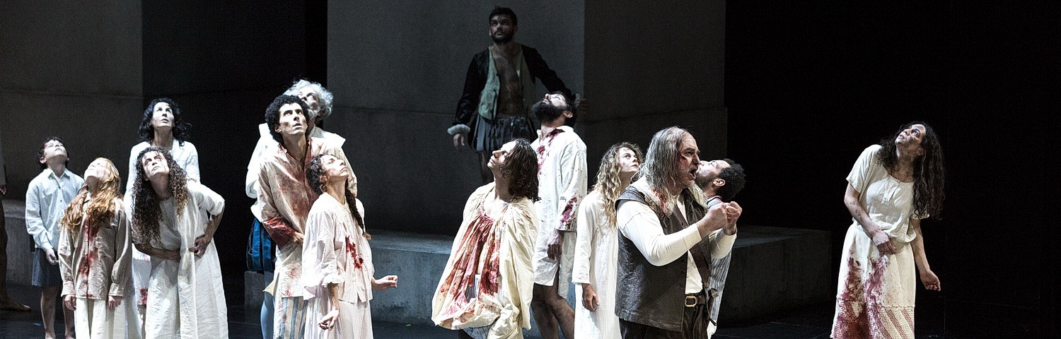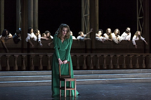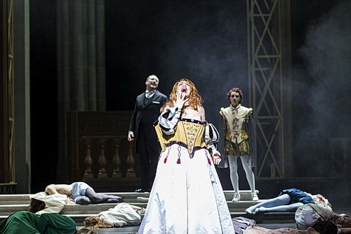 Für die Bühne von Anna Viebrock muss man auf eine tiefere Eben gehen, damit sich das Bild erklärt. Das Team ließ sich nämlich im Internationalen Reformationsmuseum in Genf inspirieren. Darum dominieren gotische Säulen und eine hölzerne Balustrade die Szenerie. Die beiden Bauten an der Seite haben allerdings keinen klerikalen Charakter, sondern stellen Transformatoren-Türme dar, wie sie seinerzeit in der Cinecittà zum Einsatz kamen. Das Filmteam taucht sporadisch auf und macht unerklärliche Zeitsprünge, die bis zur Herrschaft von Heinrich VIII. reichen. Zuckende Zombies, die ab und an die Bühne bevölkern, gemahnen an die toten Seelen der gemeuchelten Hugenotten.