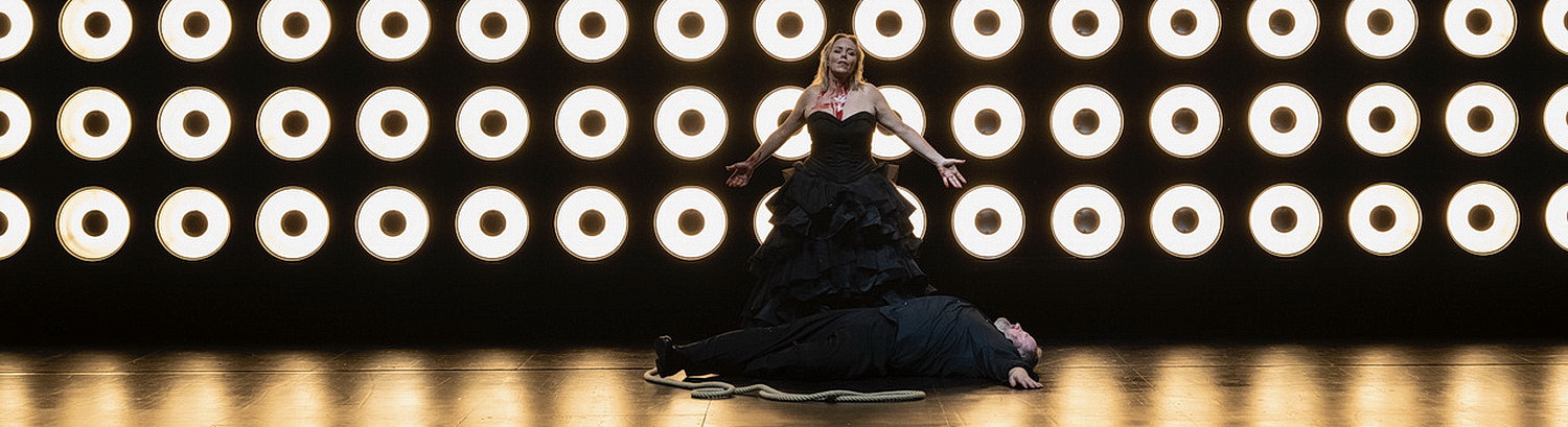 So innerlich angeregt, könnte man meinen, eine frische, eine sternendurchwirkte Inszenierung warte auf einen. Aber weit gefehlt! Bühnenbildner Henrik Ahr verbannt das Geschehen in einen fast statischen Raum, der nur durch das Licht wirken soll. Erhebt sich der Vorhang über dem ersten Akt, findet man die Elemente und Farben von draußen wieder: eine schwarze Bühne mit einem großen fahrbaren Quader darauf, dominiert vom Licht einer riesigen Wand mit 260 runden Leuchtkörpern, die senkrecht an der Bühnenhinterwand installiert ist. Die Lichtquellen können unabhängig voneinander geschaltet werden und geben die Dynamik des Geschehens auf der Bühne und aus dem Orchestergraben durch unterschiedlich intensives Leuchten wieder. Bei den Forte-Stellen und ganz besonders am Ende des Werkes blenden sie in voller Stärke in Publikum, machen eine differenzierte Wahrnehmung des Geschehens auf der Bühne unmöglich und verbleiben, wenn man aus Not die Augen schließt, noch lange als Spiegelungen, als Nachbilder auf der Netzhaut zurück. Sind die Lampen alle ausgeschaltet und metallisch grau, wirken sie wie die Spulen von den Unterfäden einer Nähmaschine, die eine ordentliche Näherin griffbereit an der Wand bereithält.