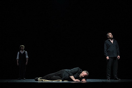 In diesem schwarz-weißen und lichtdurchfluteten Raum zeigt Regisseur Thalheimer eine Personenregie, die sehr reduziert ist. Im Interview des Programmheftes sagt er, er möchte dem Publikum keine Mode von der Stange bieten, damit es die Chance hat, seine eigene Geschichte zu entwickeln, nach seinen eigenen Vorstellungen, er möchte dem Zuschauer nicht alles vorkauen. Ein bisschen mehr als eine konzertante Vorstellung also mit gelegentlichen Platzwechseln auf schmalem Bühnenstreifen, auf dem Stefan Bolliger in der Lichtregie manch interessante Einstellungen liefert. Dürfen sich die beiden Protagonisten auf der Bühne auch kaum berühren, Isolde umarmt Tristan erst, als er tot ist, so schafft das Licht im Schatten ein Verschmelzen der Figuren, als seien beide schon im Reich des Todes, im Jenseits angekommen. Auch in der Liebesnacht bleiben die beiden im Abstand, sieht man von leichten Berührungen Tristans an Isoldes Kleid ab. Hier beginnen beide schon, sich mit Splittern des zerschellten Liebestrank-Glases zu ritzen, Blut strömt aus den Adern, innerliche Glut und den Weg ins Jenseits symbolisierend, inmitten der technisch ausgestatteten Bühne wirkt das sehr fremd. Andere Szenen geraten berührender: Als Kurwenal den sterbenden Tristan in seinem Arm immer wieder vertröstet, bis das Schiff mit Isolde kommt, treibt das so manchem die Tränen in die Augen, ist es doch bisher die einzige Szene, in der sich zwei auch körperlich näherkommen. Überhaupt ist das Ende des dritten Aktes stark, mit Tristans Fieberfantasien, Markes Auftritt und Isoldes so zart und innig gesungenen Liebestod, bei dem sie sich nun auch noch mit der Scherbe die Kehle aufschlitzen muss.