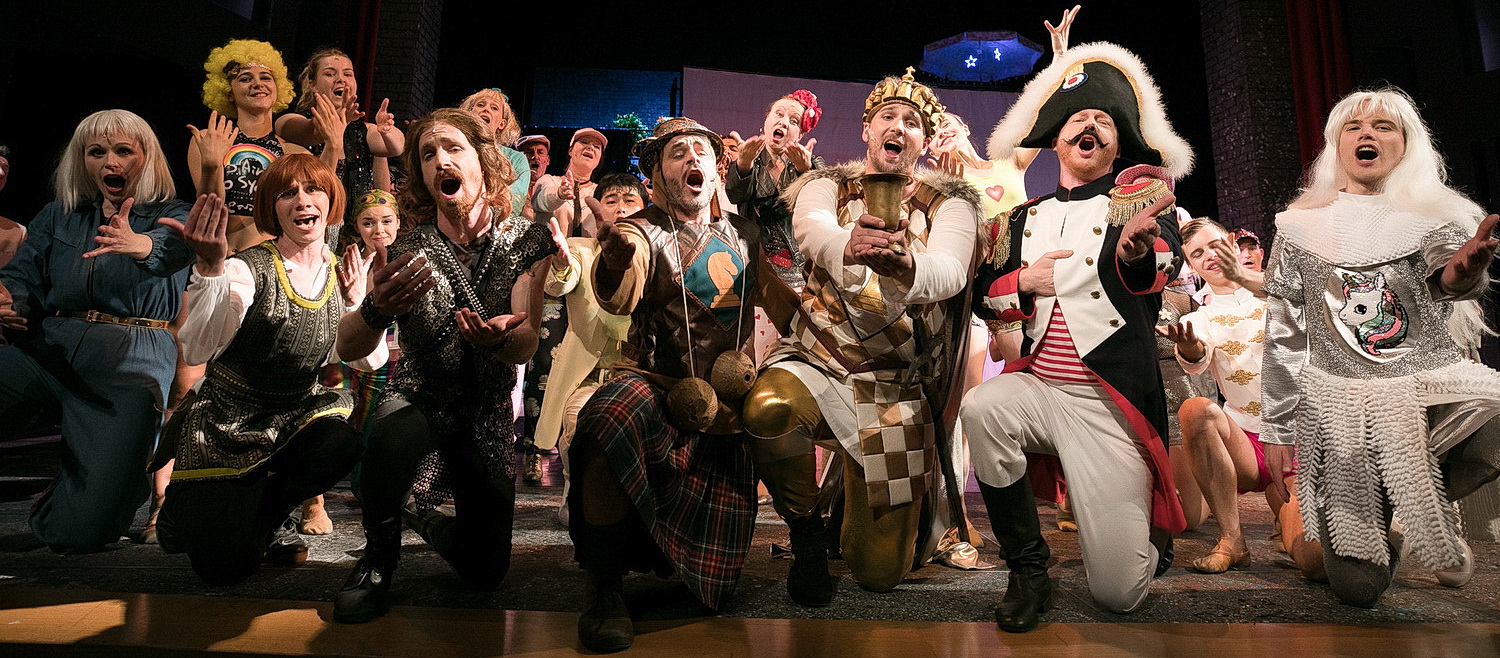 Hier gehört Spamalot zu den Produktionen der Schauspielsparte, unter Beteiligung von Chor, Ballett und Orchester. Das Ergebnis ist eine mit- und hinreißende künstlerische Kooperation mit hundertprozentigem Unterhaltungsfaktor. Regisseur Manuel Kressin und sein Ausstatter Kristopher Kempf haben im Fundus gestöbert und aus Requisiten und Versatzstücken eine Kulisse eingerichtet, die klar macht, dass es sich um ein Theater im Theater handelt. Gemeinsam brennen sie ein Feuerwerk der szenischen Fantasie und des höheren Blödsinns ab, das sich auf das wie entfesselt agierende Ensemble überträgt. Man muss sie alle nennen: den König Artus von Markus Lingstädt und seine Mannen, die jeweils mehrere Rollen spielen: Mario Radosin, Adrien Papritz, Sebastian Schlicht und Manuel Struffolino. Sie bilden ein Ensemble der Extraklasse, das singen, spielen und mit perfektem Timing Pointen setzen kann. Hinzu kommt eine Musicalentdeckung. Michaela Dazian besitzt für die Fee aus dem See eine überragende Stimme, sie hat Ausstrahlung und ist mimisch und gestisch köstlich. Kurzum: Sie ist eine Wucht.